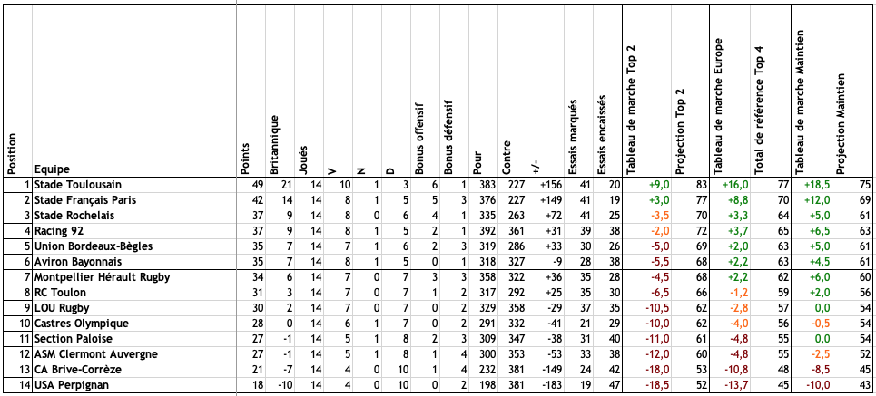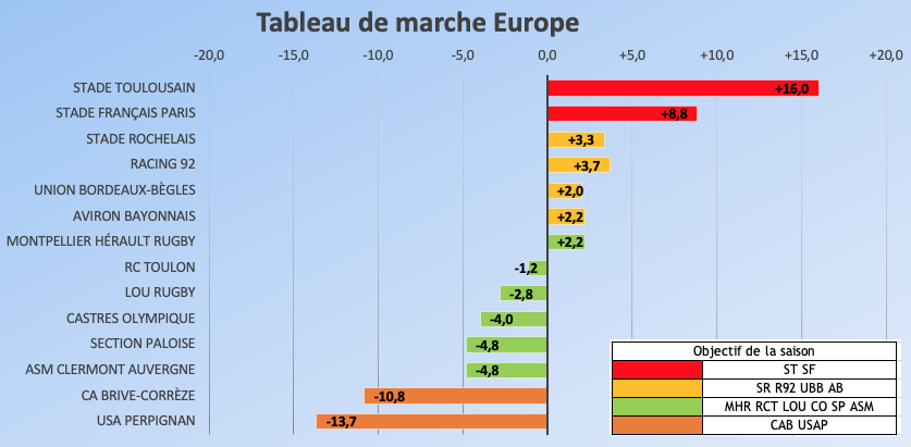 diogene Posted January 2, 2023 Author Posted January 2, 2023 Merci de ton message. Il m'a permis de corriger une erreur dans le graphique "Tableau de marche Europe". Il y a 11 heures, DarkSideOfTheMaul a dit : Dans les objectifs revus pour la saison, je laisserais quand même le MHR car je vois mal le champion sortant se contenter de viser le ventre mou... Je sais bien. On peut aussi se demander ce que fait le SF en position de demi-finaliste direct, l'ASM 11e, Bayonne dans les 6, et ainsi de suite. En début de saison, je fais un sondage qui permet de placer les clubs en fonction de leurs ambitions "supposées". À la fin des matchs aller, je remplace ce classement par une "photographie" du classement. Ce n'est pas plus réaliste, mais ça a le mérite de tenir compte du parcours déjà réalisé. Néanmoins, pour prendre en compte ton observation et vu ce classement plein de surprises, j'ai modifié (légèrement) le tableau. Plutôt qu'une simple répartition "brute", j'ai cette fois rassemblé les clubs par "blocs" de points dans le classement. Cela replace le MHR dans la course au 6 premières places. Dis-moi ce que tu en penses. Je reste bien sûr à l'écoute de toutes les autres remarques ou propositions. 3 2